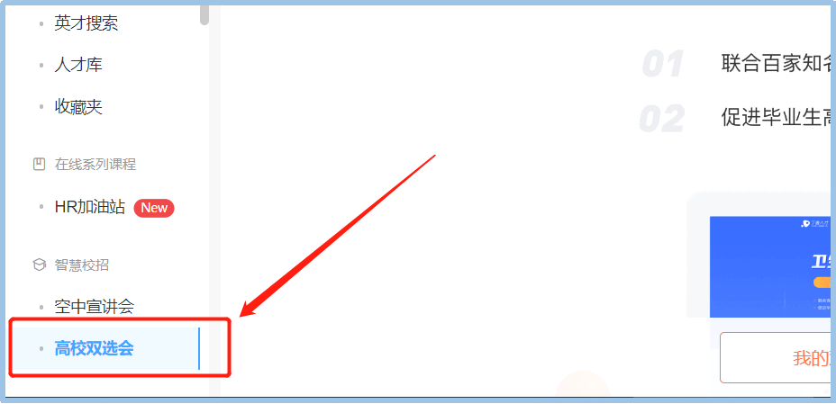 3.点击企业管理后台左侧“高校双选会”,选择需要报名的高校招聘会场次进行报名(新注册用户自动进入招聘会报名页面)