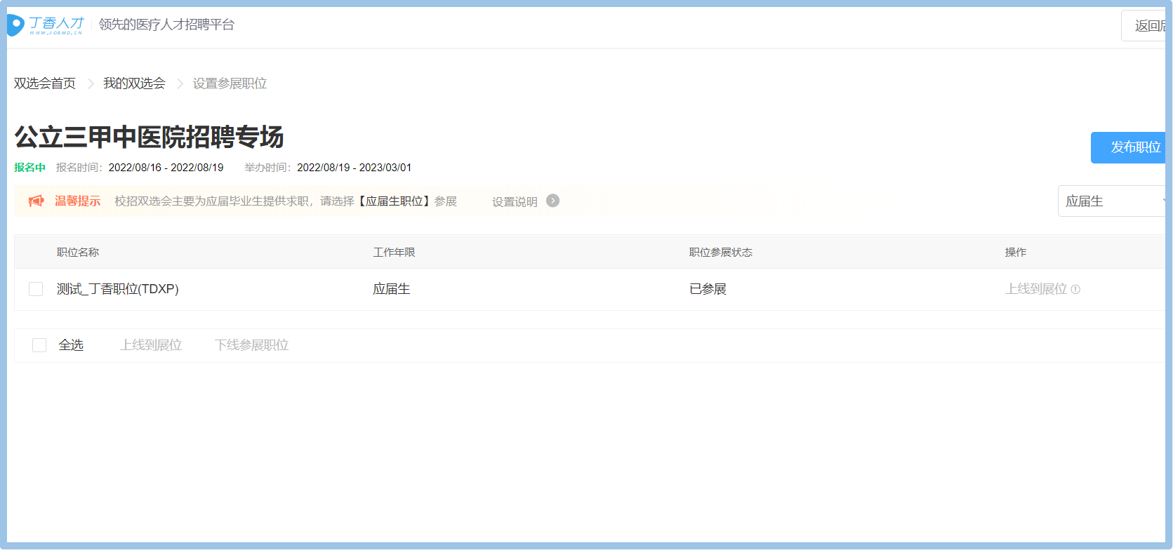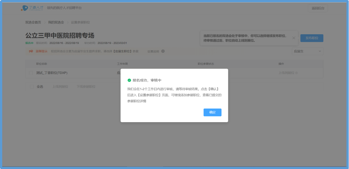 5.发布职位后即为报名完成,您可继续发布剩余参展校招职位,待工作人员审核通过后即可全部展示在招聘会页面